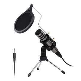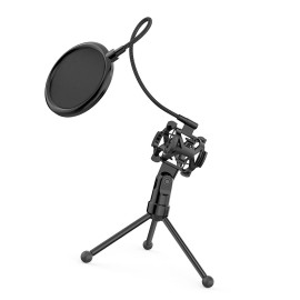 The microphone stand kit includes an anti-slip tripod stand with adjustable height, a rotatable boom arm, a microphone clip and a spring microphone clip.